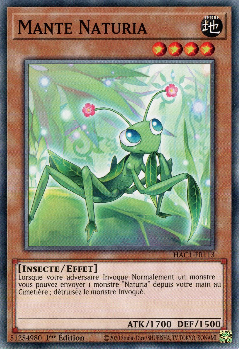 Lorsque votre adversaire Invoque Normalement un monstre, vous pouvez envoyer 1 monstre "Naturia" depuis votre main au Cimetière pour détruire ce monstre.