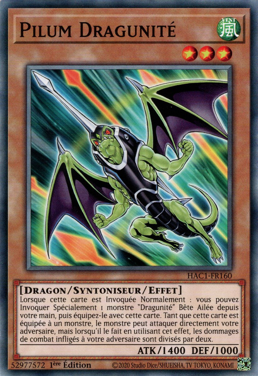 Lorsque cette carte est Invoquée Normalement, vous pouvez Invoquer Spécialement 1 monstre "Dragunité" de Type Bête Ailée depuis votre main, puis l'équiper avec cette carte. Tant que cette carte est équipée à un monstre, ce monstre peut attaquer directement votre adversaire. Si vous le faites, les dommages de combat infligés à votre adversaire (par le monstre équipé) sont divisés par deux.
