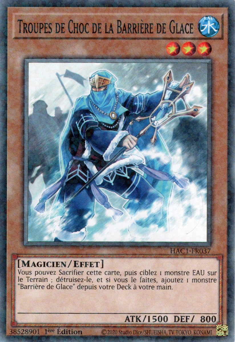 Vous pouvez Sacrifier cette carte pour sélectionner 1 monstre EAU face recto sur le Terrain, le détruire, et ajouter 1 monstre "Barrière de Glace" depuis votre Deck à votre main.