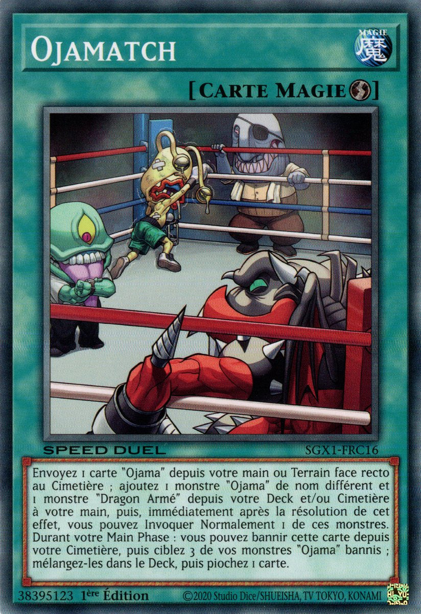Envoyez 1 carte "Ojama" depuis votre main ou Terrain face recto au Cimetière ; ajoutez 1 monstre "Ojama" de nom différent et 1 monstre "Dragon Armé" depuis votre Deck et/ou Cimetière à votre main, puis, immédiatement après la résolution de cet effet, vous pouvez Invoquer Normalement 1 de ces monstres. Durant votre Main Phase : vous pouvez bannir cette carte depuis votre Cimetière, puis ciblez 3 de vos monstres "Ojama" bannis ; mélangez-les dans le Deck, puis piochez 1 carte.