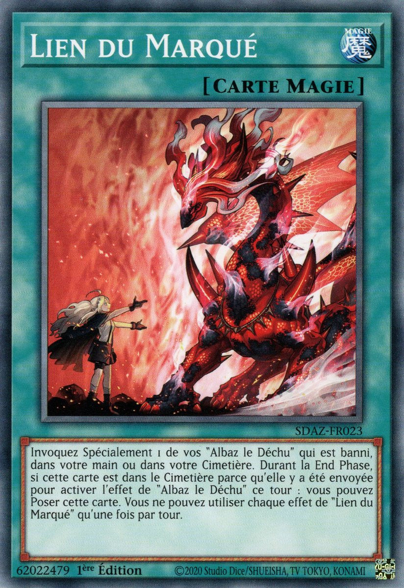 Invoquez Spécialement 1 de vos "Albaz le Déchu" qui est banni, dans votre main ou dans votre Cimetière. Durant la End Phase, si cette carte est dans le Cimetière parce qu'elle y a été envoyée pour activer l'effet de "Albaz le Déchu" ce tour : vous pouvez Poser cette carte. Vous ne pouvez utiliser chaque effet de "Lien du Marqué" qu'une fois par tour.