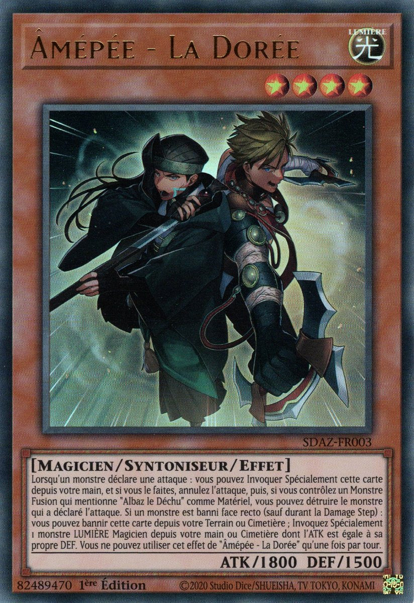 Lorsqu'un monstre déclare une attaque : vous pouvez Invoquer Spécialement cette carte depuis votre main, et si vous le faites, annulez l'attaque, puis, si vous contrôlez un Monstre Fusion qui mentionne "Albaz le Déchu" comme Matériel, vous pouvez détruire le monstre qui a déclaré l'attaque. Si un monstre est banni face recto (sauf durant la Damage Step) : vous pouvez bannir cette carte depuis votre Terrain ou Cimetière ; Invoquez Spécialement 1 monstre LUMIÈRE Magicien depuis votre main ou Cimetière dont l'ATK est égale à sa propre DEF. Vous ne pouvez utiliser cet effet de "Âmépée - La Dorée" qu'une fois par tour.