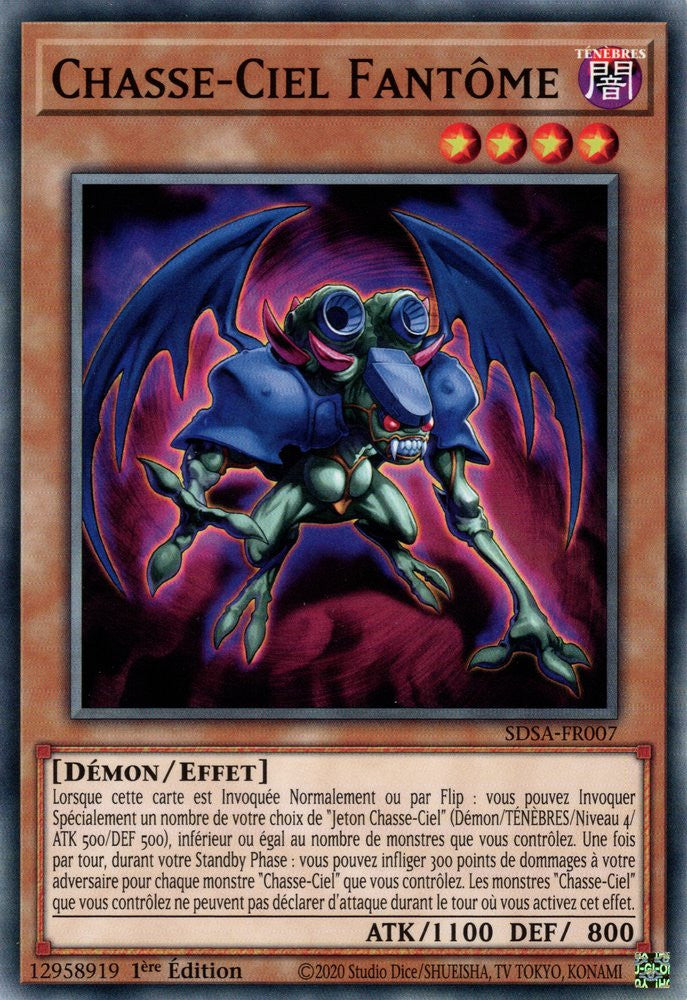 Lorsque cette carte est Invoquée Normalement ou par Flip : vous pouvez Invoquer Spécialement un nombre de votre choix de "Jeton Chasse-Ciel" (Démon/TÉNÈBRES/Niveau 4/ATK 500/DEF 500), inférieur ou égal au nombre de monstres que vous contrôlez. Une fois par tour, durant votre Standby Phase : vous pouvez infliger 300 points de dommages à votre adversaire pour chaque monstre "Chasse-Ciel" que vous contrôlez. Les monstres "Chasse-Ciel" que vous contrôlez ne peuvent pas déclarer d'attaque durant le tour où vous activez cet effet.