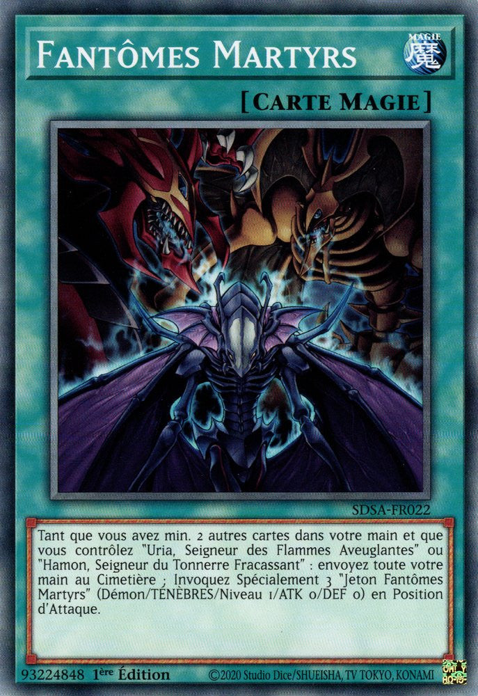 Tant que vous avez min. 2 autres cartes dans votre main et que vous contrôlez "Uria, Seigneur des Flammes Aveuglantes" ou "Hamon, Seigneur du Tonnerre Fracassant" : envoyez toute votre main au Cimetière ; Invoquez Spécialement 3 "Jeton Fantômes Martyrs" (Démon/TÉNÈBRES/Niveau 1/ATK 0/DEF 0) en Position d'Attaque.