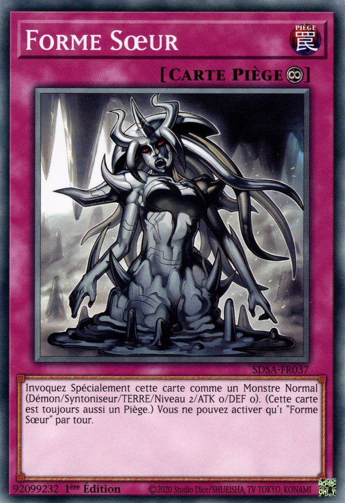 Invoquez Spécialement cette carte comme un Monstre Normal (Démon/Syntoniseur/TERRE/Niveau 2/ATK 0/DEF 0). (Cette carte est toujours aussi un Piège.) Vous ne pouvez activer qu'1 "Forme Sœur" par tour.
