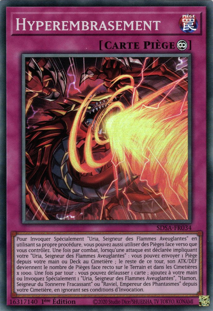 Pour Invoquer Spécialement "Uria, Seigneur des Flammes Aveuglantes" en utilisant sa propre procédure, vous pouvez aussi utiliser des Pièges face verso que vous contrôlez. Une fois par combat, lorsqu'une attaque est déclarée impliquant votre "Uria, Seigneur des Flammes Aveuglantes" : vous pouvez envoyer 1 Piège depuis votre main ou Deck au Cimetière ; le reste de ce tour, son ATK/DEF deviennent le nombre de Pièges face recto sur le Terrain et dans les Cimetières x 1000. Une fois par tour : vous pouvez défausser 1 carte ; ajoutez à votre main ou Invoquez Spécialement 1 "Uria, Seigneur des Flammes Aveuglantes", "Hamon, Seigneur du Tonnerre Fracassant" ou "Raviel, Empereur des Phantasmes" depuis votre Cimetière, en ignorant ses conditions d'Invocation.