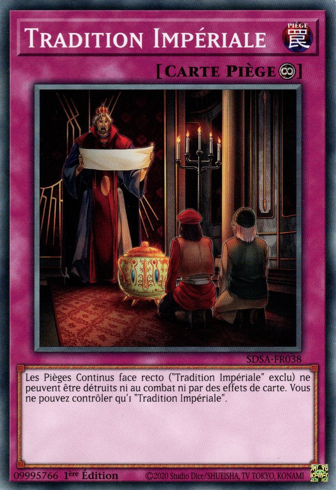 Les Pièges Continus face recto ("Tradition Impériale" exclu) ne peuvent être détruits ni au combat ni par des effets de carte. Vous ne pouvez contrôler qu'1 "Tradition Impériale".