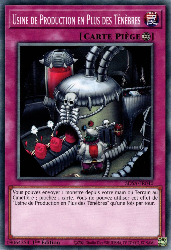 Vous pouvez envoyer 1 monstre depuis votre main ou Terrain au Cimetière ; piochez 1 carte. Vous ne pouvez utiliser cet effet de "Usine de Production en Plus des Ténèbres" qu'une fois par tour.