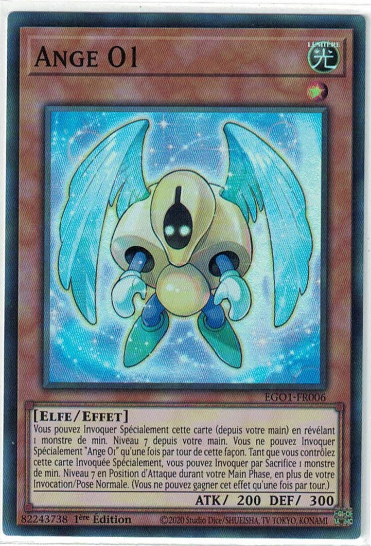 Vous pouvez Invoquer Spécialement cette carte (depuis votre main) en révélant 1 monstre de min. Niveau 7 depuis votre main. Vous ne pouvez Invoquer Spécialement "Ange O1" qu'une fois par tour de cette façon. Tant que vous contrôlez cette carte Invoquée Spécialement, vous pouvez Invoquer par Sacrifice 1 monstre de min. Niveau 7 en Position d'Attaque durant votre Main Phase, en plus de votre Invocation/Pose Normale. (Vous ne pouvez gagner cet effet qu'une fois par tour.)