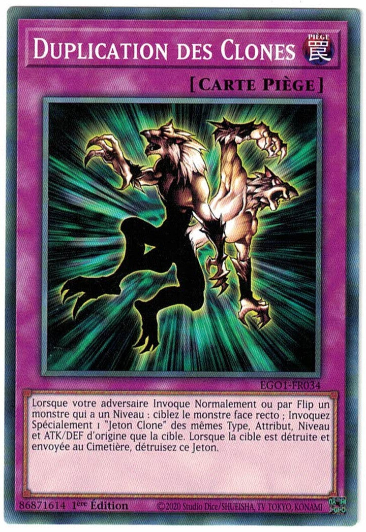 Lorsque votre adversaire Invoque Normalement ou par Flip un monstre qui a un Niveau : ciblez le monstre face recto ; Invoquez Spécialement 1 "Jeton Clone" des mêmes Type, Attribut, Niveau et ATK/DEF d'origine que la cible. Lorsque la cible est détruite et envoyée au Cimetière, détruisez ce Jeton.