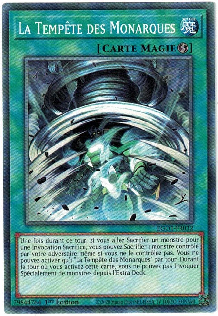 Une fois durant ce tour, si vous allez Sacrifier un monstre pour une Invocation Sacrifice, vous pouvez Sacrifier 1 monstre contrôlé par votre adversaire même si vous ne le contrôlez pas. Vous ne pouvez activer qu'1 "La Tempête des Monarques" par tour. Durant le tour où vous activez cette carte, vous ne pouvez pas Invoquer Spécialement de monstres depuis l'Extra Deck.
