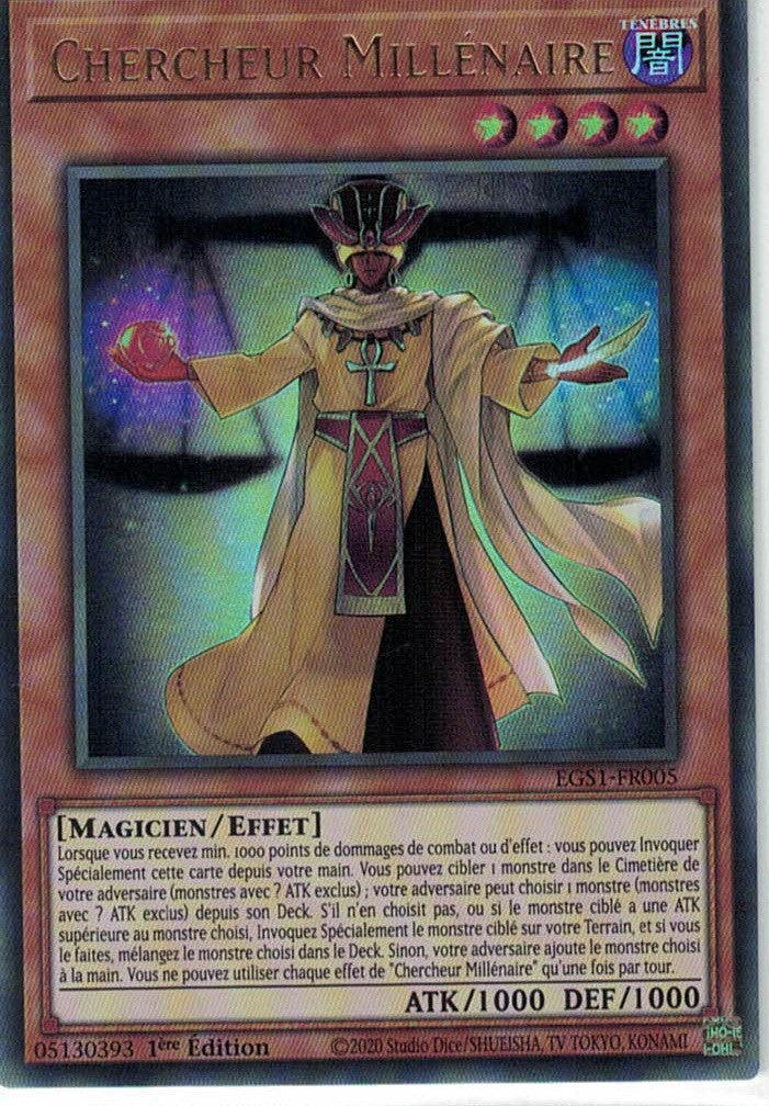 Lorsque vous recevez min. 1000 points de dommages de combat ou d'effet : vous pouvez Invoquer Spécialement cette carte depuis votre main. Vous pouvez cibler 1 monstre dans le Cimetière de votre adversaire (monstres avec ? ATK exclus) ; votre adversaire peut choisir 1 monstre (monstres avec ? ATK exclus) depuis son Deck. S'il n'en choisit pas, ou si le monstre ciblé a une ATK supérieure au monstre choisi, Invoquez Spécialement le monstre ciblé sur votre Terrain, et si vous le faites, mélangez le monstre choisi dans le Deck. Sinon, votre adversaire ajoute le monstre choisi à la main. Vous ne pouvez utiliser chaque effet de "Chercheur Millénaire" qu'une fois par tour.