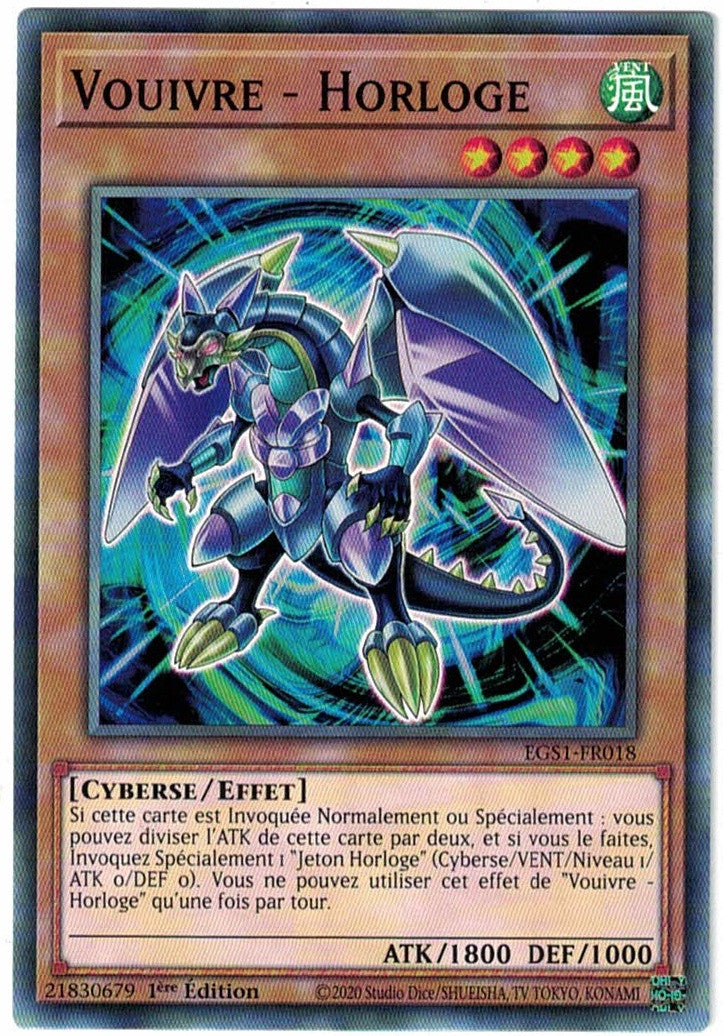 Si cette carte est Invoquée Normalement ou Spécialement : vous pouvez diviser l'ATK de cette carte par deux, et si vous le faites, Invoquez Spécialement 1 "Jeton Horloge" (Cyberse/VENT/Niveau 1/ATK 0/DEF 0). Vous ne pouvez utiliser cet effet de "Vouivre - Horloge" qu'une fois par tour.