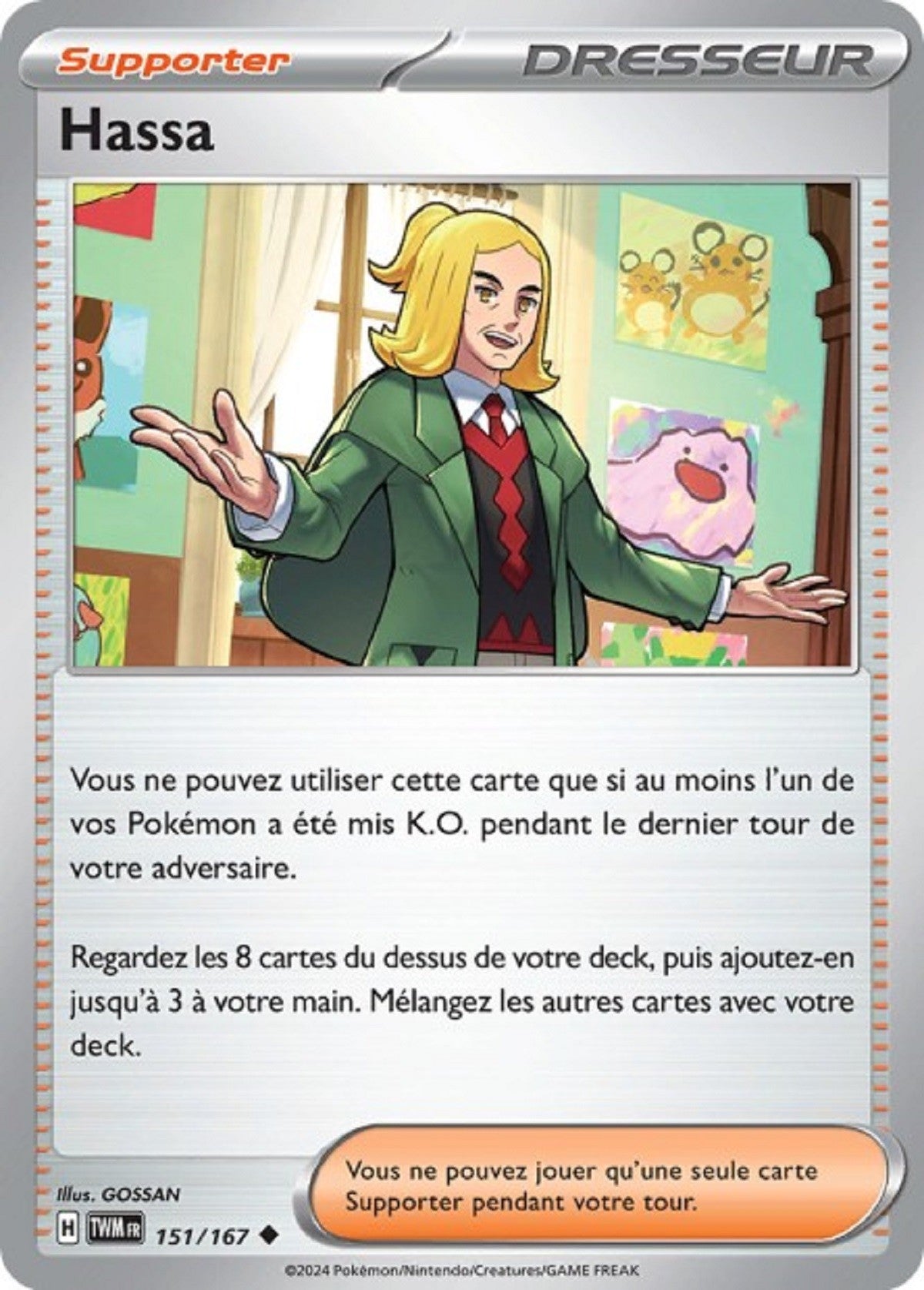 Nos cartes à l’unité sont généralement en état neuf ou proche du neuf ("sortie de booster"), sauf mention spécifique. Malgré tout, certaines imperfections peuvent exister dès la sortie de l’usine (micro-rayures, léger centrage, coins très légèrement marqués), et sont considérées comme des défauts d’origine.