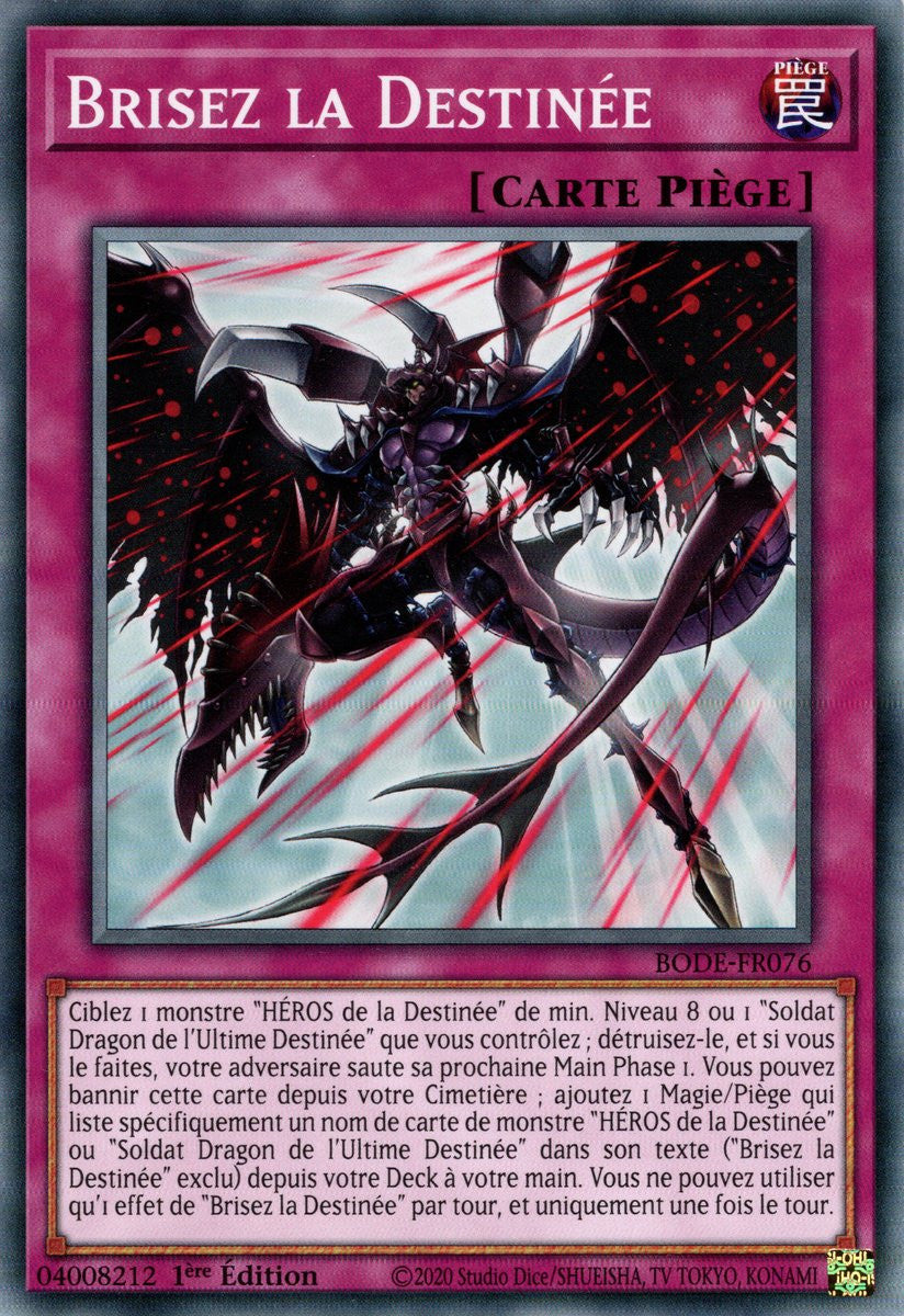 Ciblez 1 monstre "HÉROS de la Destinée" de min. Niveau 8 ou 1 "Soldat Dragon de l'Ultime Destinée" que vous contrôlez ; détruisez-le, et si vous le faites, votre adversaire saute sa prochaine Main Phase 1. Vous pouvez bannir cette carte depuis votre Cimetière ; ajoutez 1 Magie/Piège qui liste spécifiquement un nom de carte de monstre "HÉROS de la Destinée" ou "Soldat Dragon de l'Ultime Destinée" dans son texte ("Brisez la Destinée" exclu) depuis votre Deck à votre main. Vous ne pouvez utiliser qu'1 effet de "Brisez la Destinée" par tour, et uniquement une fois le tour.