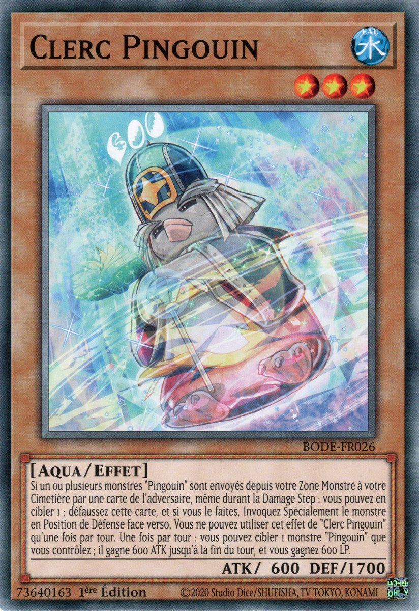 Si un ou plusieurs monstres "Pingouin" sont envoyés depuis votre Zone Monstre à votre Cimetière par une carte de l'adversaire, même durant la Damage Step : vous pouvez en cibler 1 ; défaussez cette carte, et si vous le faites, Invoquez Spécialement le monstre en Position de Défense face verso. Vous ne pouvez utiliser cet effet de "Clerc Pingouin" qu'une fois par tour. Une fois par tour : vous pouvez cibler 1 monstre "Pingouin" que vous contrôlez ; il gagne 600 ATK jusqu'à la fin du tour, et vous gagnez 600 LP.