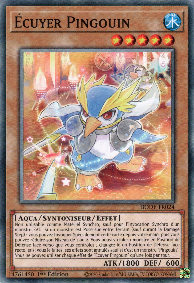 Non utilisable comme Matériel Synchro, sauf pour l'Invocation Synchro d'un monstre EAU. Si un monstre est Posé sur votre Terrain (sauf durant la Damage Step) : vous pouvez Invoquer Spécialement cette carte depuis votre main, puis vous pouvez réduire son Niveau de 1 ou 2. Vous pouvez cibler 1 monstre en Position de Défense face verso que vous contrôlez ; changez-le en Position de Défense face recto, et si vous le faites, ses effets sont annulés sauf si c'est un monstre "Pingouin". Vous ne pouvez utiliser chaque effet de "Écuyer Pingouin" qu'une fois par tour.