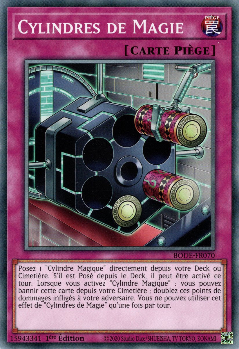 Posez 1 "Cylindre Magique" directement depuis votre Deck ou Cimetière. S'il est Posé depuis le Deck, il peut être activé ce tour. Lorsque vous activez "Cylindre Magique" : vous pouvez bannir cette carte depuis votre Cimetière ; doublez ces points de dommages infligés à votre adversaire. Vous ne pouvez utiliser cet effet de "Cylindres de Magie" qu'une fois par tour.