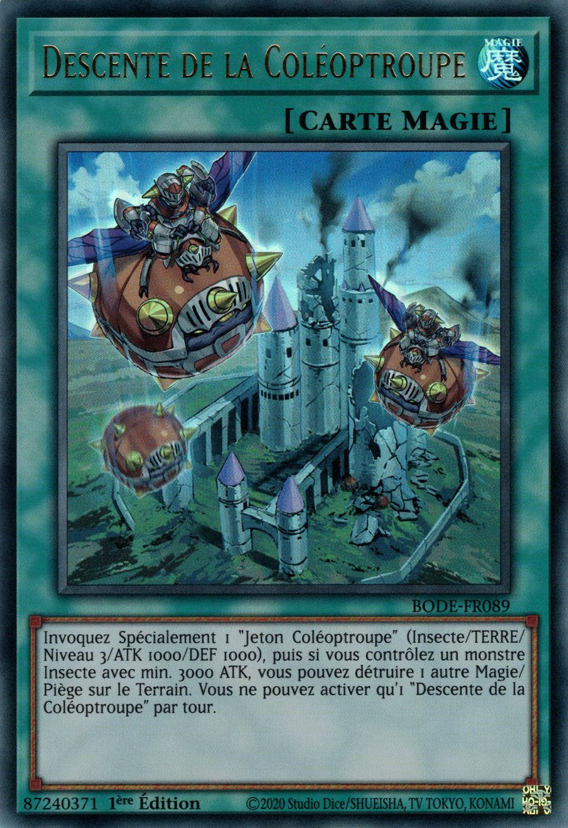 Invoquez Spécialement 1 "Jeton Coléoptroupe" (Insecte/TERRE/Niveau 3/ATK 1000/DEF 1000), puis si vous contrôlez un monstre Insecte avec min. 3000 ATK, vous pouvez détruire 1 autre Magie/Piège sur le Terrain. Vous ne pouvez activer qu'1 "Descente de la Coléoptroupe" par tour.