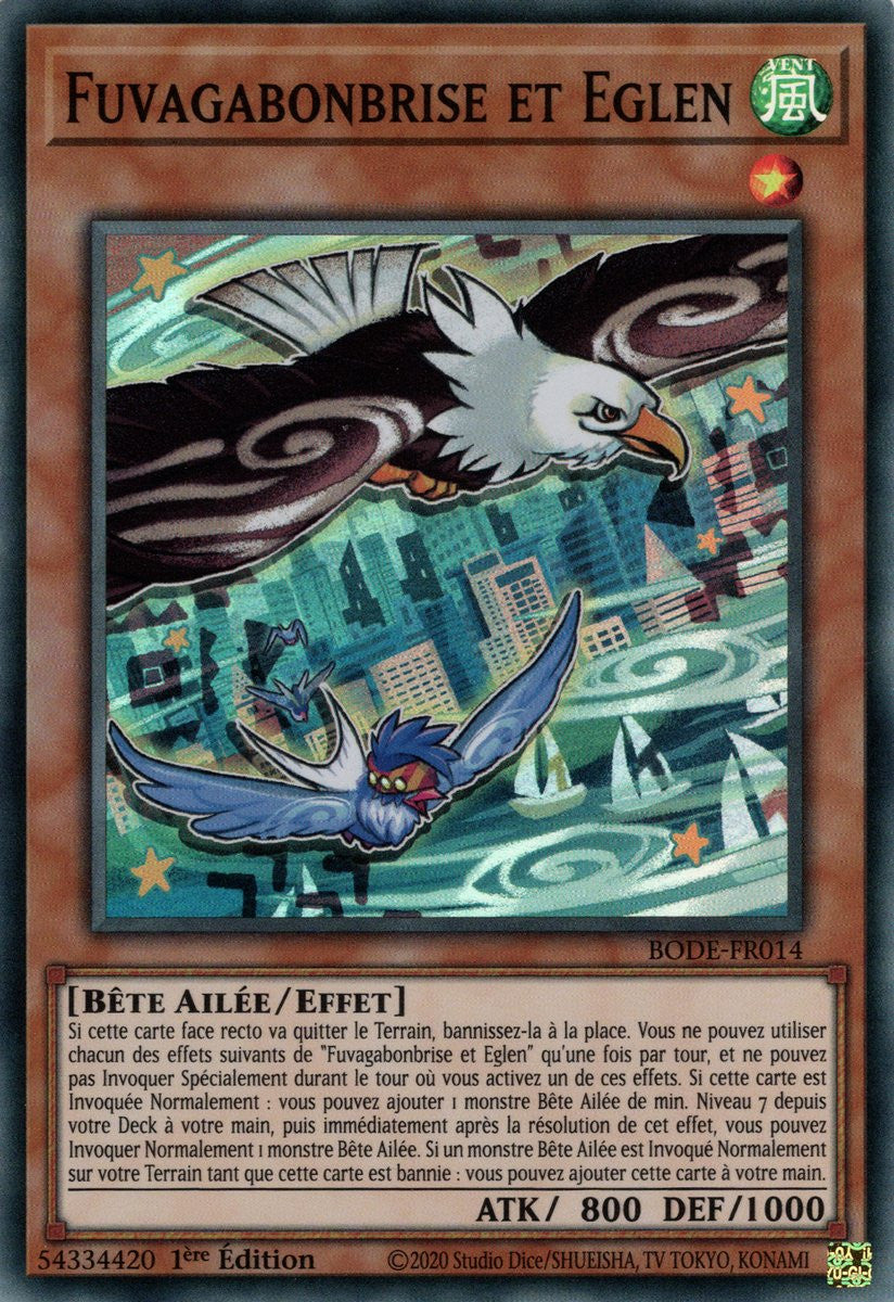 Si cette carte face recto va quitter le Terrain, bannissez-la à la place. Vous ne pouvez utiliser chacun des effets suivants de "Fuvagabonbrise et Eglen" qu'une fois par tour, et ne pouvez pas Invoquer Spécialement durant le tour où vous activez un de ces effets. Si cette carte est Invoquée Normalement : vous pouvez ajouter 1 monstre Bête Ailée de min. Niveau 7 depuis votre Deck à votre main, puis immédiatement après la résolution de cet effet, vous pouvez Invoquer Normalement 1 monstre Bête Ailée. Si un monstre Bête Ailée est Invoqué Normalement sur votre Terrain tant que cette carte est bannie : vous pouvez ajouter cette carte à votre main.