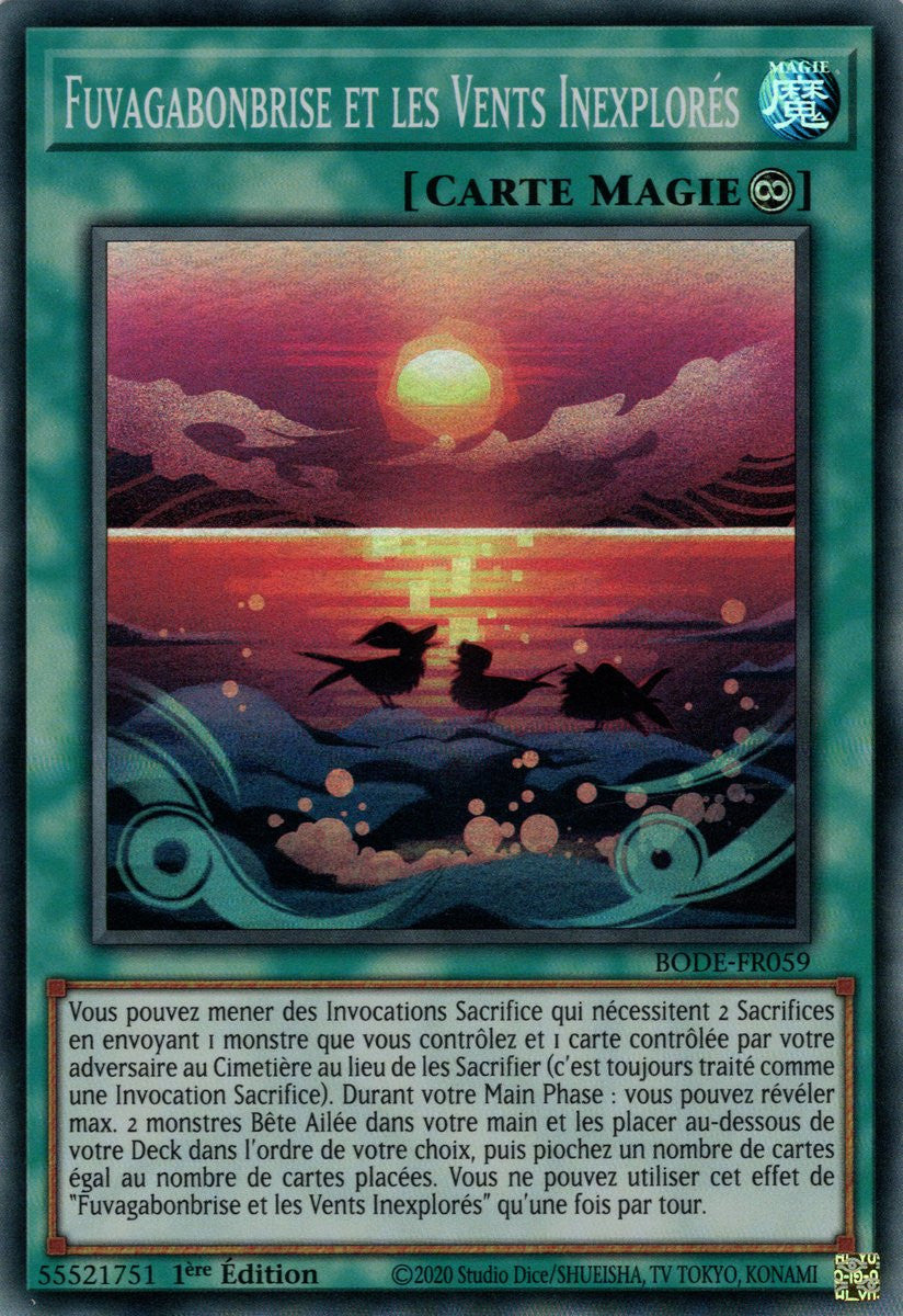Vous pouvez mener des Invocations Sacrifice qui nécessitent 2 Sacrifices en envoyant 1 monstre que vous contrôlez et 1 carte contrôlée par votre adversaire au Cimetière au lieu de les Sacrifier (c'est toujours traité comme une Invocation Sacrifice). Durant votre Main Phase : vous pouvez révéler max. 2 monstres Bête Ailée dans votre main et les placer au-dessous de votre Deck dans l'ordre de votre choix, puis piochez un nombre de cartes égal au nombre de cartes placées. Vous ne pouvez utiliser cet effet de "Fuvagabonbrise et les Vents Inexplorés" qu'une fois par tour.
