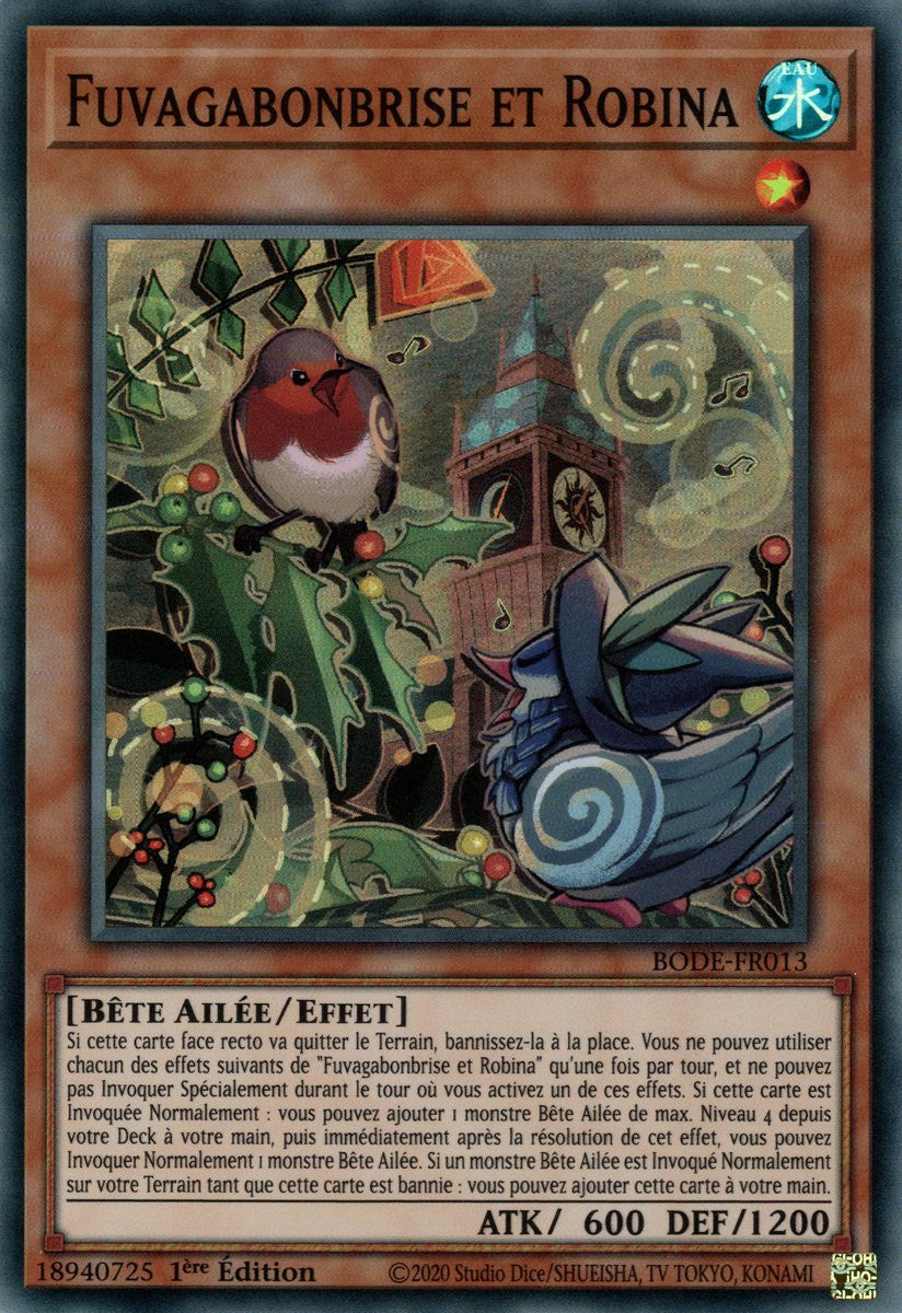 Si cette carte face recto va quitter le Terrain, bannissez-la à la place. Vous ne pouvez utiliser chacun des effets suivants de "Fuvagabonbrise et Robina" qu'une fois par tour, et ne pouvez pas Invoquer Spécialement durant le tour où vous activez un de ces effets. Si cette carte est Invoquée Normalement : vous pouvez ajouter 1 monstre Bête Ailée de max. Niveau 4 depuis votre Deck à votre main, puis immédiatement après la résolution de cet effet, vous pouvez Invoquer Normalement 1 monstre Bête Ailée. Si un monstre Bête Ailée est Invoqué Normalement sur votre Terrain tant que cette carte est bannie : vous pouvez ajouter cette carte à votre main.