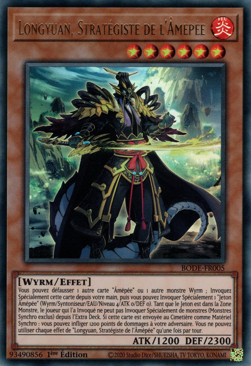 Vous pouvez défausser 1 autre carte "Âmépée" ou 1 autre monstre Wyrm ; Invoquez Spécialement cette carte depuis votre main, puis vous pouvez Invoquer Spécialement 1 "Jeton Âmépée" (Wyrm/Syntoniseur/EAU/Niveau 4/ATK 0/DEF 0). Tant que le Jeton est dans la Zone Monstre, le joueur qui l'a Invoqué ne peut pas Invoquer Spécialement de monstres (Monstres Synchro exclus) depuis l'Extra Deck. Si cette carte est envoyée au Cimetière comme Matériel Synchro : vous pouvez infliger 1200 points de dommages à votre adversaire. Vous ne pouvez utiliser chaque effet de "Longyuan, Stratégiste de l'Âmépée" qu'une fois par tour.