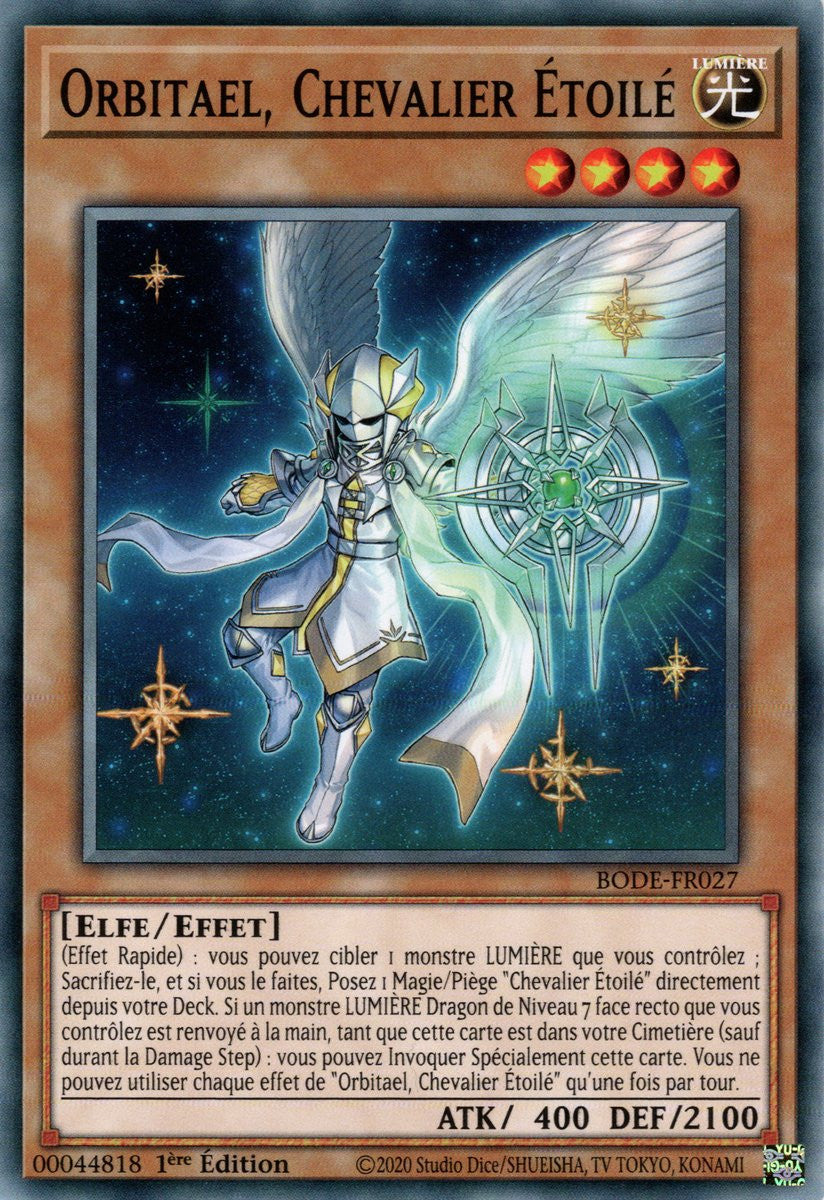 (Effet Rapide) : vous pouvez cibler 1 monstre LUMIÈRE que vous contrôlez ; Sacrifiez-le, et si vous le faites, Posez 1 Magie/Piège "Chevalier Étoilé" directement depuis votre Deck. Si un monstre LUMIÈRE Dragon de Niveau 7 face recto que vous contrôlez est renvoyé à la main, tant que cette carte est dans votre Cimetière (sauf durant la Damage Step) : vous pouvez Invoquer Spécialement cette carte. Vous ne pouvez utiliser chaque effet de "Orbitael, Chevalier Étoilé" qu'une fois par tour.