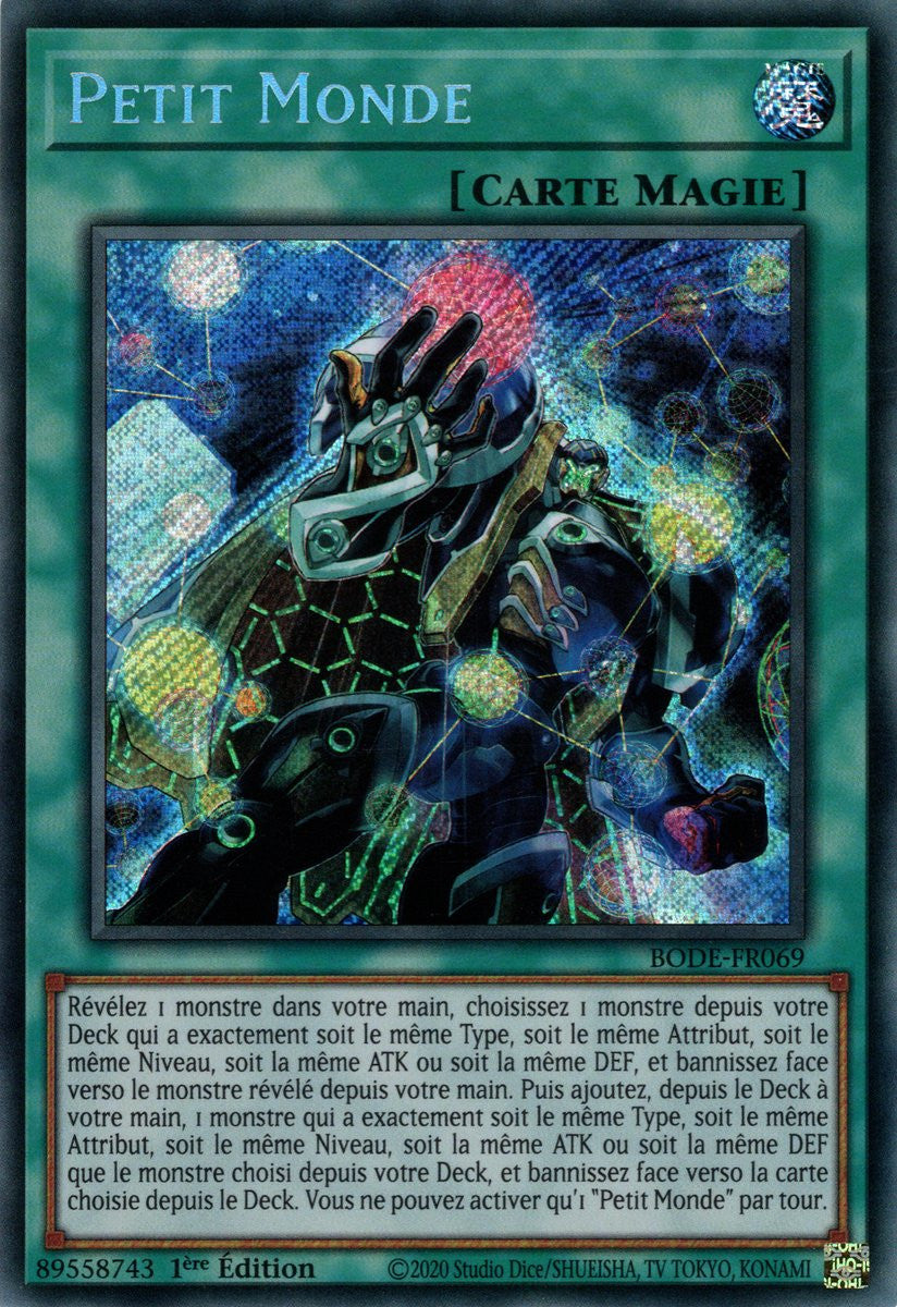 Révélez 1 monstre dans votre main, choisissez 1 monstre depuis votre Deck qui a exactement soit le même Type, soit le même Attribut, soit le même Niveau, soit la même ATK ou soit la même DEF, et bannissez face verso le monstre révélé depuis votre main. Puis ajoutez, depuis le Deck à votre main, 1 monstre qui a exactement soit le même Type, soit le même Attribut, soit le même Niveau, soit la même ATK ou soit la même DEF que le monstre choisi depuis votre Deck, et bannissez face verso la carte choisie depuis le Deck. Vous ne pouvez activer qu'1 "Petit Monde" par tour.