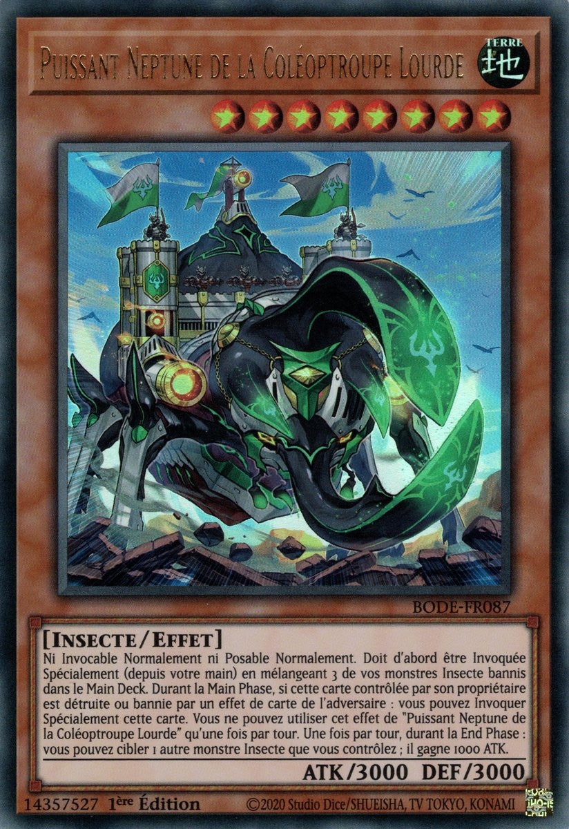 Ni Invocable Normalement ni Posable Normalement. Doit d'abord être Invoquée Spécialement (depuis votre main) en mélangeant 3 de vos monstres Insecte bannis dans le Main Deck. Durant la Main Phase, si cette carte contrôlée par son propriétaire est détruite ou bannie par un effet de carte de l'adversaire : vous pouvez Invoquer Spécialement cette carte. Vous ne pouvez utiliser cet effet de "Puissant Neptune de la Coléoptroupe Lourde" qu'une fois par tour. Une fois par tour, durant la End Phase : vous pouvez cibler 1 autre monstre Insecte que vous contrôlez ; il gagne 1000 ATK.