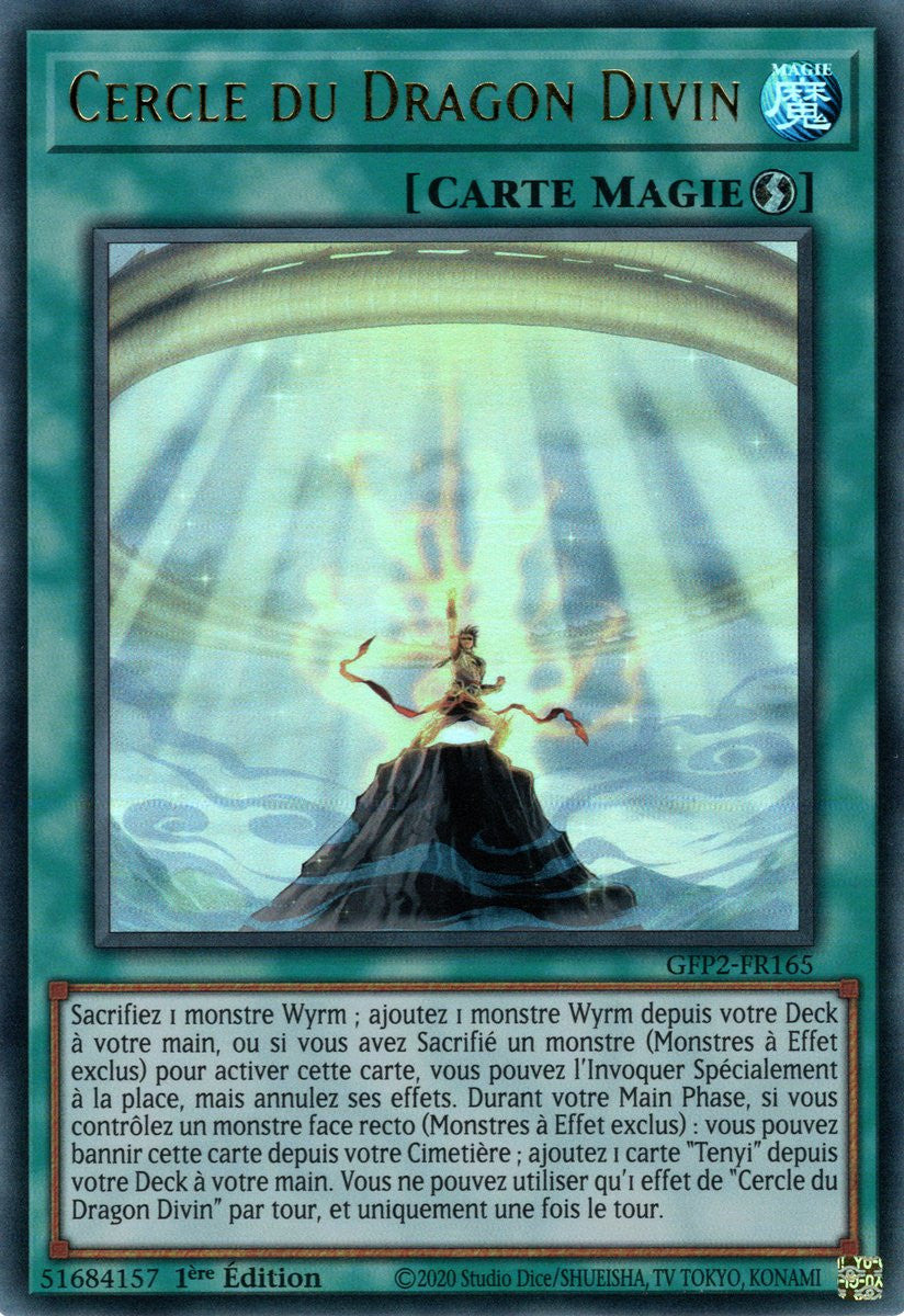 Sacrifiez 1 monstre Wyrm ; ajoutez 1 monstre Wyrm depuis votre Deck à votre main, ou si vous avez Sacrifié un monstre (Monstres à Effet exclus) pour activer cette carte, vous pouvez l'Invoquer Spécialement à la place, mais annulez ses effets. Durant votre Main Phase, si vous contrôlez un monstre face recto (Monstres à Effet exclus) : vous pouvez bannir cette carte depuis votre Cimetière ; ajoutez 1 carte "Tenyi" depuis votre Deck à votre main. Vous ne pouvez utiliser qu'1 effet de "Cercle du Dragon Divin" par tour, et uniquement une fois le tour.
