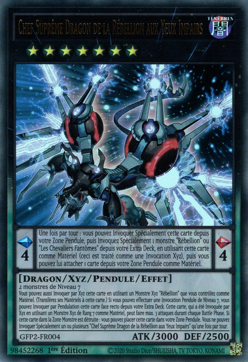 Vous pouvez aussi Invoquer par Xyz cette carte en utilisant un Monstre Xyz "Rébellion" que vous contrôlez comme Matériel. (Transférez ses Matériels à cette carte.) Si vous pouvez effectuer une Invocation Pendule de Niveau 7, vous pouvez Invoquer par Pendulation cette carte face recto depuis votre Extra Deck. Cette carte, qui a été Invoquée par Xyz en utilisant un Monstre Xyz de Rang 7 comme Matériel, peut faire max. 3 attaques durant chaque Battle Phase. Si cette carte dans la Zone Monstre est détruite : vous pouvez placer cette carte dans votre Zone Pendule. Vous ne pouvez Invoquer Spécialement un ou plusieurs "Chef Suprême Dragon de la Rébellion aux Yeux Impairs" qu'une fois par tour.