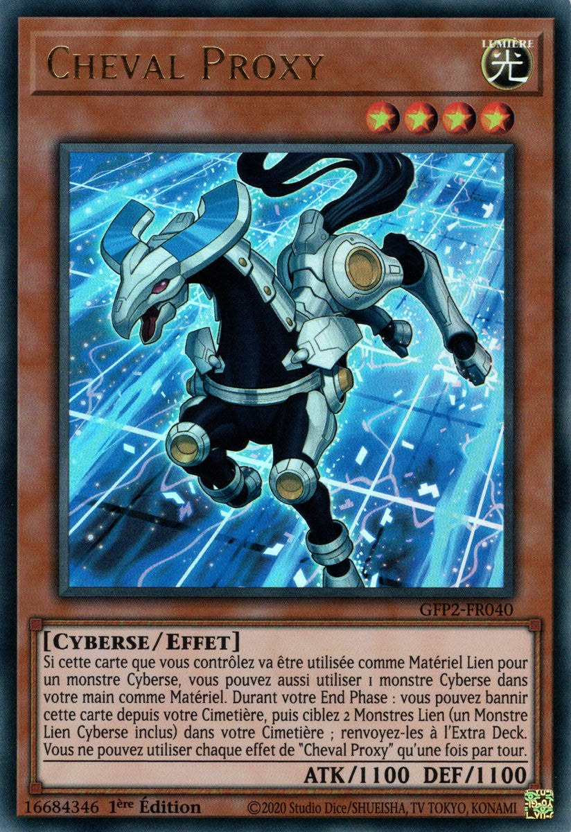 Si cette carte que vous contrôlez va être utilisée comme Matériel Lien pour un monstre Cyberse, vous pouvez aussi utiliser 1 monstre Cyberse dans votre main comme Matériel. Durant votre End Phase : vous pouvez bannir cette carte depuis votre Cimetière, puis ciblez 2 Monstres Lien (un Monstre Lien Cyberse inclus) dans votre Cimetière ; renvoyez-les à l'Extra Deck. Vous ne pouvez utiliser chaque effet de "Cheval Proxy" qu'une fois par tour.