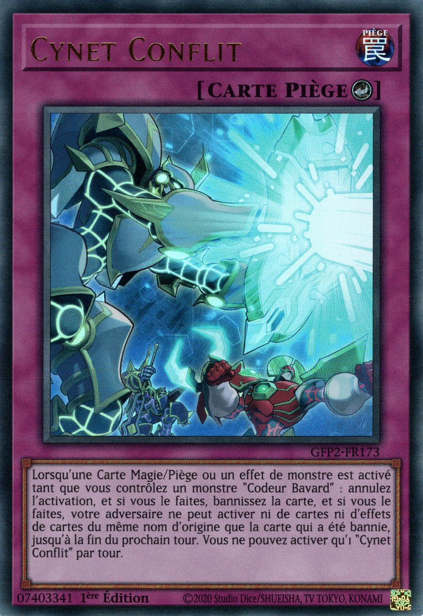 Lorsqu'une Carte Magie/Piège ou un effet de monstre est activé tant que vous contrôlez un monstre "Codeur Bavard" : annulez l'activation, et si vous le faites, bannissez la carte, et si vous le faites, votre adversaire ne peut activer ni de cartes ni d'effets de cartes du même nom d'origine que la carte qui a été bannie, jusqu'à la fin du prochain tour. Vous ne pouvez activer qu'1 "Cynet Conflit" par tour.