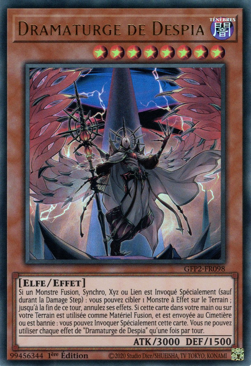 Si un Monstre Fusion, Synchro, Xyz ou Lien est Invoqué Spécialement (sauf durant la Damage Step) : vous pouvez cibler 1 Monstre à Effet sur le Terrain ; jusqu'à la fin de ce tour, annulez ses effets. Si cette carte dans votre main ou sur votre Terrain est utilisée comme Matériel Fusion, et est envoyée au Cimetière ou est bannie : vous pouvez Invoquer Spécialement cette carte. Vous ne pouvez utiliser chaque effet de "Dramaturge de Despia" qu'une fois par tour.