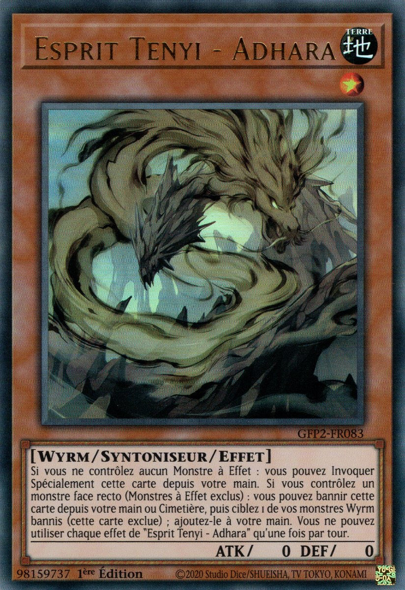 Si vous ne contrôlez aucun Monstre à Effet : vous pouvez Invoquer Spécialement cette carte depuis votre main. Si vous contrôlez un monstre face recto (Monstres à Effet exclus) : vous pouvez bannir cette carte depuis votre main ou Cimetière, puis ciblez 1 de vos monstres Wyrm bannis (cette carte exclue) ; ajoutez-le à votre main. Vous ne pouvez utiliser chaque effet de "Esprit Tenyi - Adhara" qu'une fois par tour.