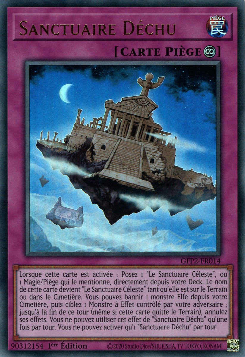 Lorsque cette carte est activée : Posez 1 "Le Sanctuaire Céleste", ou 1 Magie/Piège qui le mentionne, directement depuis votre Deck. Le nom de cette carte devient "Le Sanctuaire Céleste" tant qu'elle est sur le Terrain ou dans le Cimetière. Vous pouvez bannir 1 monstre Elfe depuis votre Cimetière, puis ciblez 1 Monstre à Effet contrôlé par votre adversaire ; jusqu'à la fin de ce tour (même si cette carte quitte le Terrain), annulez ses effets. Vous ne pouvez utiliser cet effet de "Sanctuaire Déchu" qu'une fois par tour. Vous ne pouvez activer qu'1 "Sanctuaire Déchu" par tour.