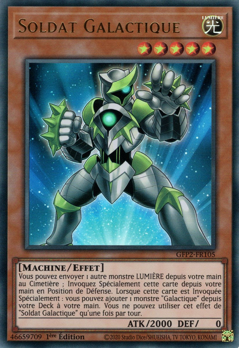 Vous pouvez envoyer 1 autre monstre LUMIÈRE depuis votre main au Cimetière ; Invoquez Spécialement cette carte depuis votre main en Position de Défense. Lorsque cette carte est Invoquée Spécialement : vous pouvez ajouter 1 monstre "Galactique" depuis votre Deck à votre main. Vous ne pouvez utiliser cet effet de "Soldat Galactique" qu'une fois par tour.