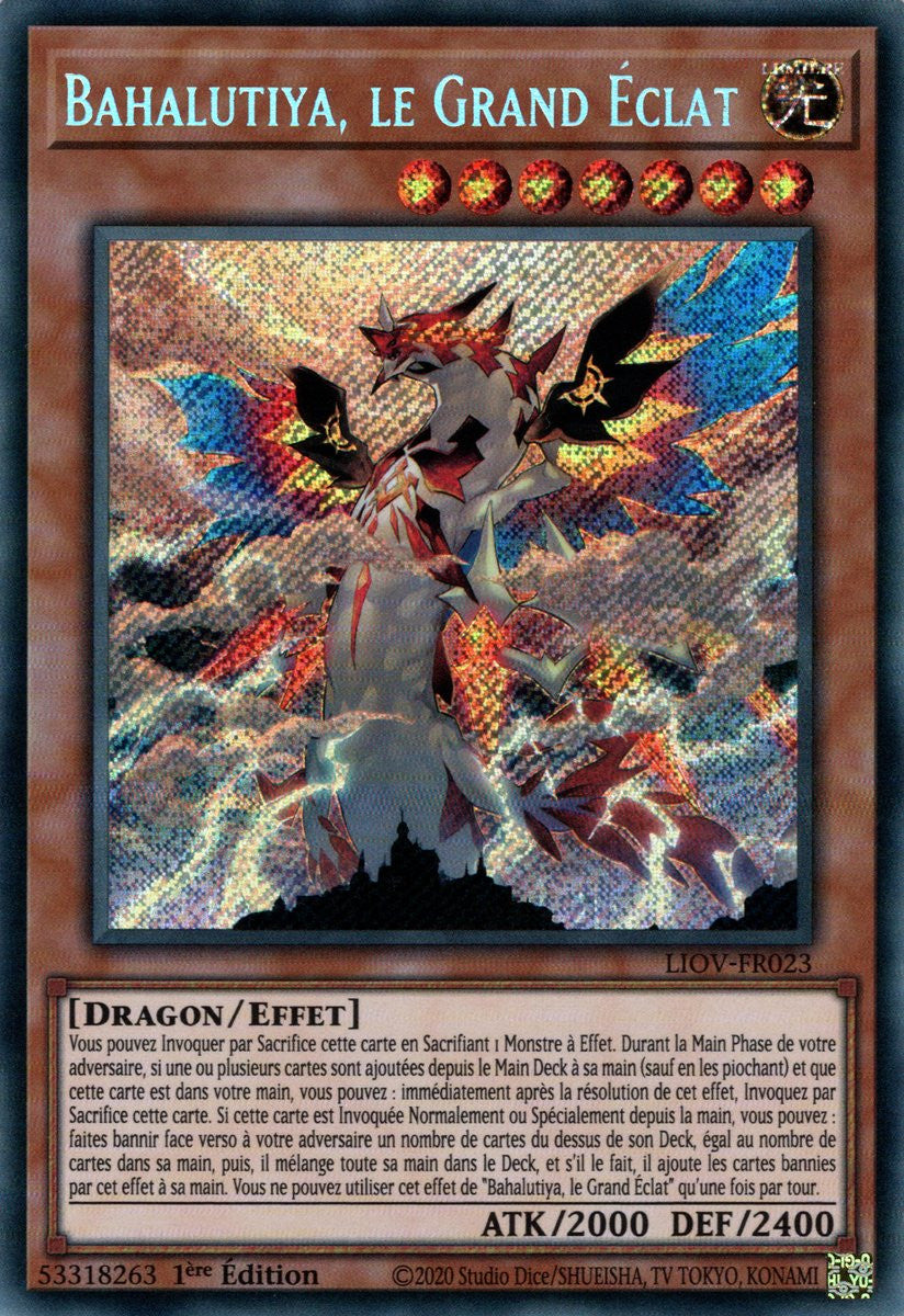 Vous pouvez Invoquer par Sacrifice cette carte en Sacrifiant 1 Monstre à Effet. Durant la Main Phase de votre adversaire, si une ou plusieurs cartes sont ajoutées depuis le Main Deck à sa main (sauf en les piochant) et que cette carte est dans votre main, vous pouvez : immédiatement après la résolution de cet effet, Invoquez par Sacrifice cette carte. Si cette carte est Invoquée Normalement ou Spécialement depuis la main, vous pouvez : faites bannir face verso à votre adversaire un nombre de cartes du dessus de son Deck, égal au nombre de cartes dans sa main, puis, il mélange toute sa main dans le Deck, et s'il le fait, il ajoute les cartes bannies par cet effet à sa main. Vous ne pouvez utiliser cet effet de "Bahalutiya, le Grand Éclat" qu'une fois par tour.