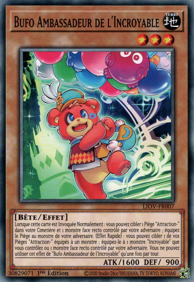 Lorsque cette carte est Invoquée Normalement : vous pouvez cibler 1 Piège "Attraction-" dans votre Cimetière et 1 monstre face recto contrôlé par votre adversaire ; équipez le Piège au monstre de votre adversaire. (Effet Rapide) : vous pouvez cibler 1 de vos Pièges "Attraction-" équipés à un monstre ; équipez-le à 1 monstre "Incroyable" que vous contrôlez ou 1 monstre face recto contrôlé par votre adversaire. Vous ne pouvez utiliser cet effet de "Bufo Ambassadeur de l'Incroyable" qu'une fois par tour.