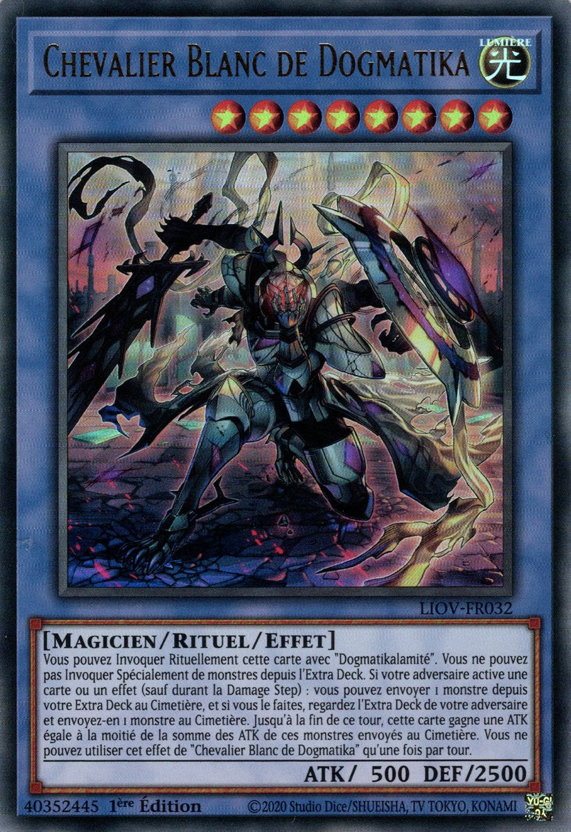 Vous pouvez Invoquer Rituellement cette carte avec "Dogmatikalamité". Vous ne pouvez pas Invoquer Spécialement de monstres depuis l'Extra Deck. Si votre adversaire active une carte ou un effet (sauf durant la Damage Step) : vous pouvez envoyer 1 monstre depuis votre Extra Deck au Cimetière, et si vous le faites, regardez l'Extra Deck de votre adversaire et envoyez-en 1 monstre au Cimetière. Jusqu'à la fin de ce tour, cette carte gagne une ATK égale à la moitié de la somme des ATK de ces monstres envoyés au Cimetière. Vous ne pouvez utiliser cet effet de "Chevalier Blanc de Dogmatika" qu'une fois par tour.