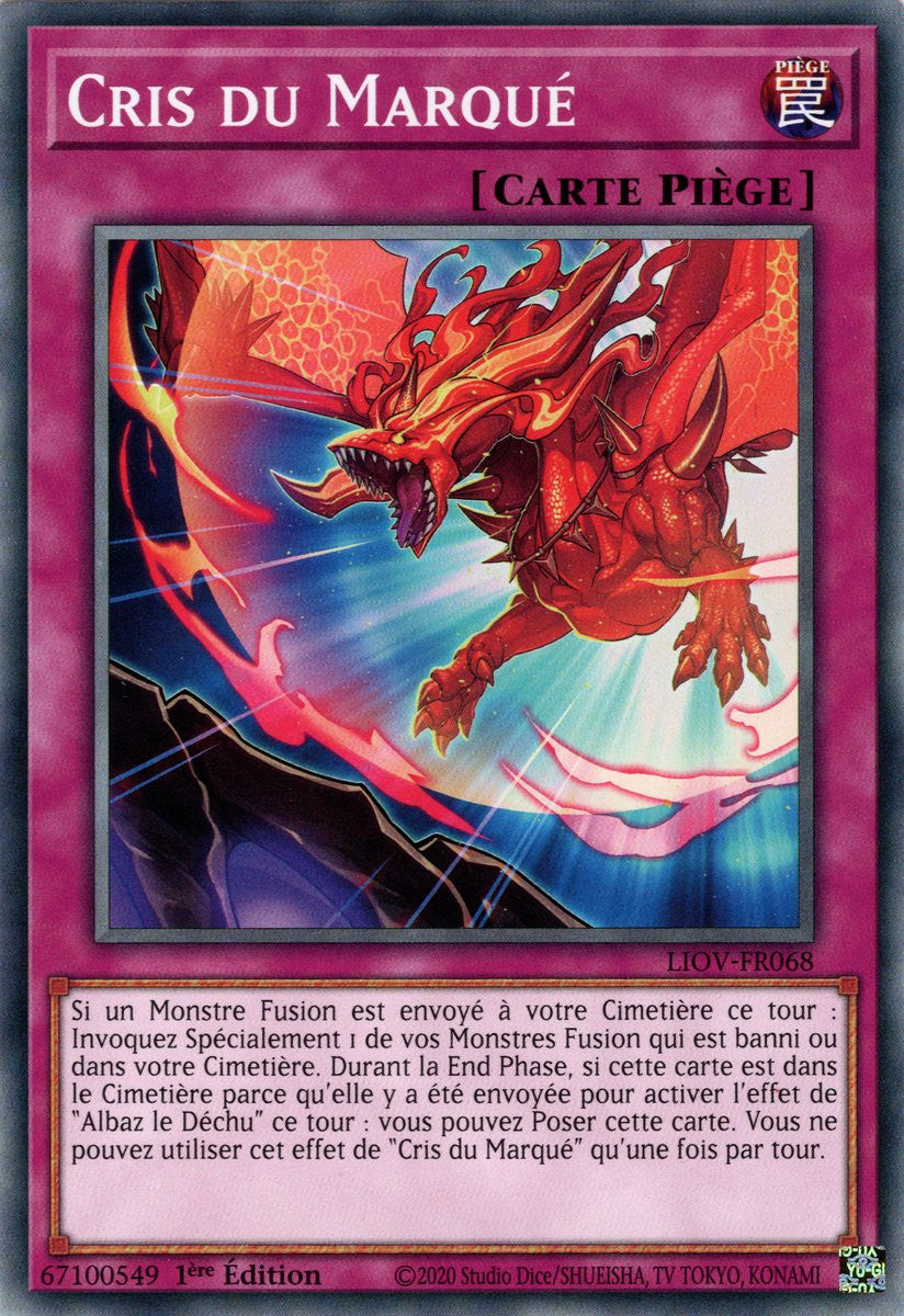Si un Monstre Fusion est envoyé à votre Cimetière ce tour : Invoquez Spécialement 1 de vos Monstres Fusion qui est banni ou dans votre Cimetière. Durant la End Phase, si cette carte est dans le Cimetière parce qu'elle y a été envoyée pour activer l'effet de "Albaz le Déchu" ce tour : vous pouvez Poser cette carte. Vous ne pouvez utiliser cet effet de "Cris du Marqué" qu'une fois par tour.