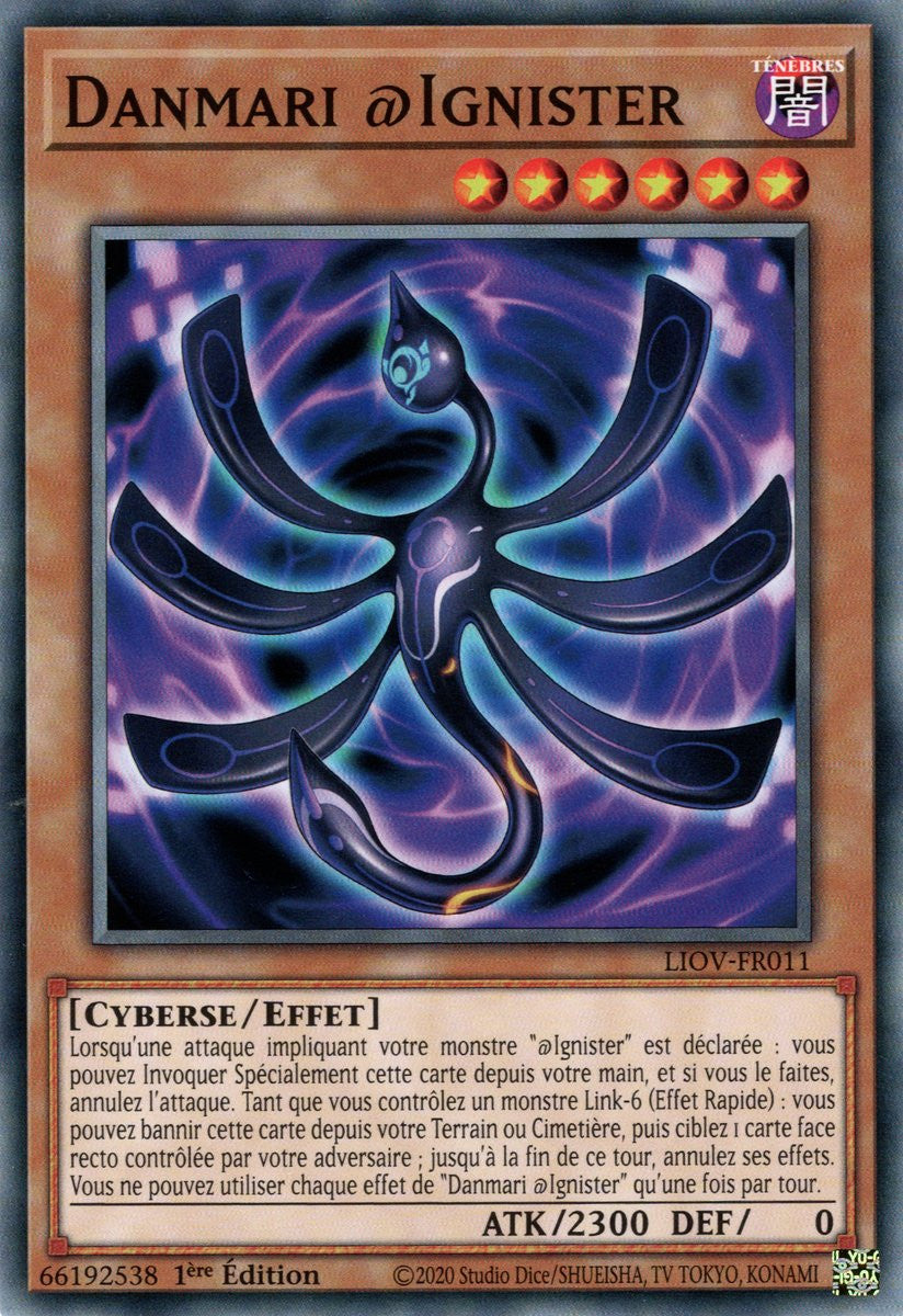 Lorsqu'une attaque impliquant votre monstre "@Ignister" est déclarée : vous pouvez Invoquer Spécialement cette carte depuis votre main, et si vous le faites, annulez l'attaque. Tant que vous contrôlez un monstre Link-6 (Effet Rapide) : vous pouvez bannir cette carte depuis votre Terrain ou Cimetière, puis ciblez 1 carte face recto contrôlée par votre adversaire ; jusqu'à la fin de ce tour, annulez ses effets. Vous ne pouvez utiliser chaque effet de "Danmari @Ignister" qu'une fois par tour.