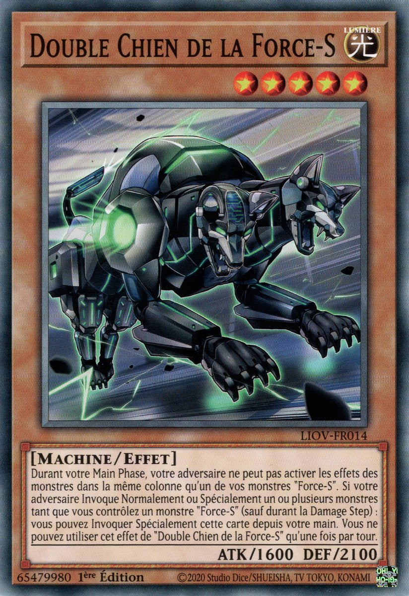 Durant votre Main Phase, votre adversaire ne peut pas activer les effets des monstres dans la même colonne qu'un de vos monstres "Force-S". Si votre adversaire Invoque Normalement ou Spécialement un ou plusieurs monstres tant que vous contrôlez un monstre "Force-S" (sauf durant la Damage Step) : vous pouvez Invoquer Spécialement cette carte depuis votre main. Vous ne pouvez utiliser cet effet de "Double Chien de la Force-S" qu'une fois par tour.