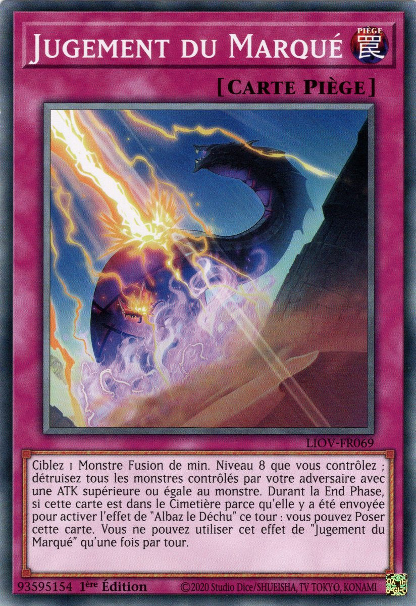 Ciblez 1 Monstre Fusion de min. Niveau 8 que vous contrôlez ; détruisez tous les monstres contrôlés par votre adversaire avec une ATK supérieure ou égale au monstre. Durant la End Phase, si cette carte est dans le Cimetière parce qu'elle y a été envoyée pour activer l'effet de "Albaz le Déchu" ce tour : vous pouvez Poser cette carte. Vous ne pouvez utiliser cet effet de "Jugement du Marqué" qu'une fois par tour.