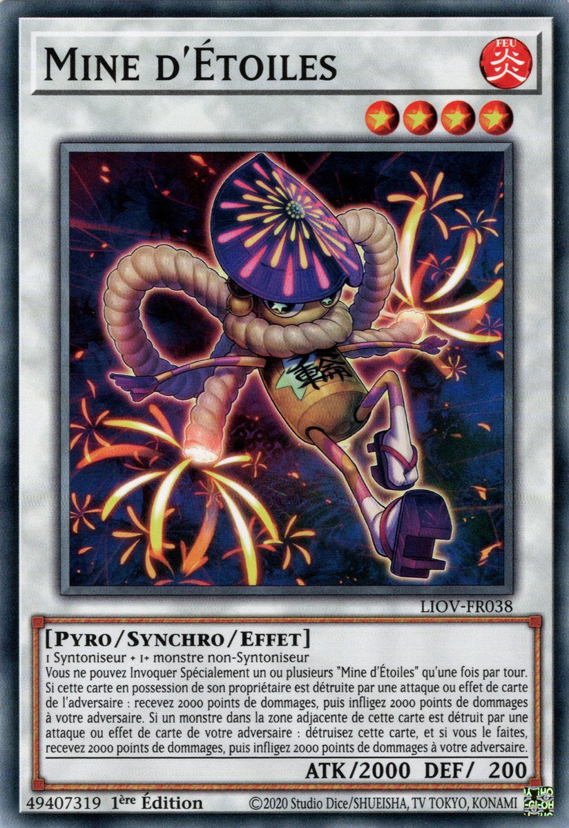 Vous ne pouvez Invoquer Spécialement un ou plusieurs "Mine d'Étoiles" qu'une fois par tour. Si cette carte en possession de son propriétaire est détruite par une attaque ou effet de carte de l'adversaire : recevez 2000 points de dommages, puis infligez 2000 points de dommages à votre adversaire. Si un monstre dans la zone adjacente de cette carte est détruit par une attaque ou effet de carte de votre adversaire : détruisez cette carte, et si vous le faites, recevez 2000 points de dommages, puis infligez 2000 points de dommages à votre adversaire.