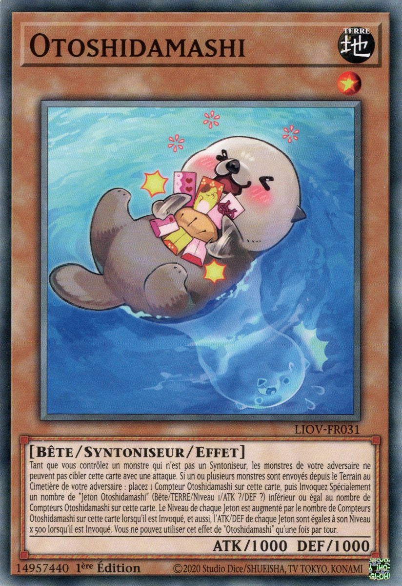 Tant que vous contrôlez un monstre qui n'est pas un Syntoniseur, les monstres de votre adversaire ne peuvent pas cibler cette carte avec une attaque. Si un ou plusieurs monstres sont envoyés depuis le Terrain au Cimetière de votre adversaire : placez 1 Compteur Otoshidamashi sur cette carte, puis Invoquez Spécialement un nombre de "Jeton Otoshidamashi" (Bête/TERRE/Niveau 1/ATK ?/DEF ?) inférieur ou égal au nombre de Compteurs Otoshidamashi sur cette carte. Le Niveau de chaque Jeton est augmenté par le nombre de Compteurs Otoshidamashi sur cette carte lorsqu'il est Invoqué, et aussi, l'ATK/DEF de chaque Jeton sont égales à son Niveau x 500 lorsqu'il est Invoqué. Vous ne pouvez utiliser cet effet de "Otoshidamashi" qu'une fois par tour.