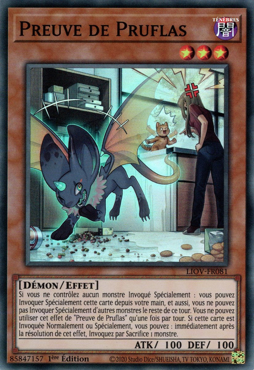 Si vous ne contrôlez aucun monstre Invoqué Spécialement : vous pouvez Invoquer Spécialement cette carte depuis votre main, et aussi, vous ne pouvez pas Invoquer Spécialement d'autres monstres le reste de ce tour. Vous ne pouvez utiliser cet effet de "Preuve de Pruflas" qu'une fois par tour. Si cette carte est Invoquée Normalement ou Spécialement, vous pouvez : immédiatement après la résolution de cet effet, Invoquez par Sacrifice 1 monstre.