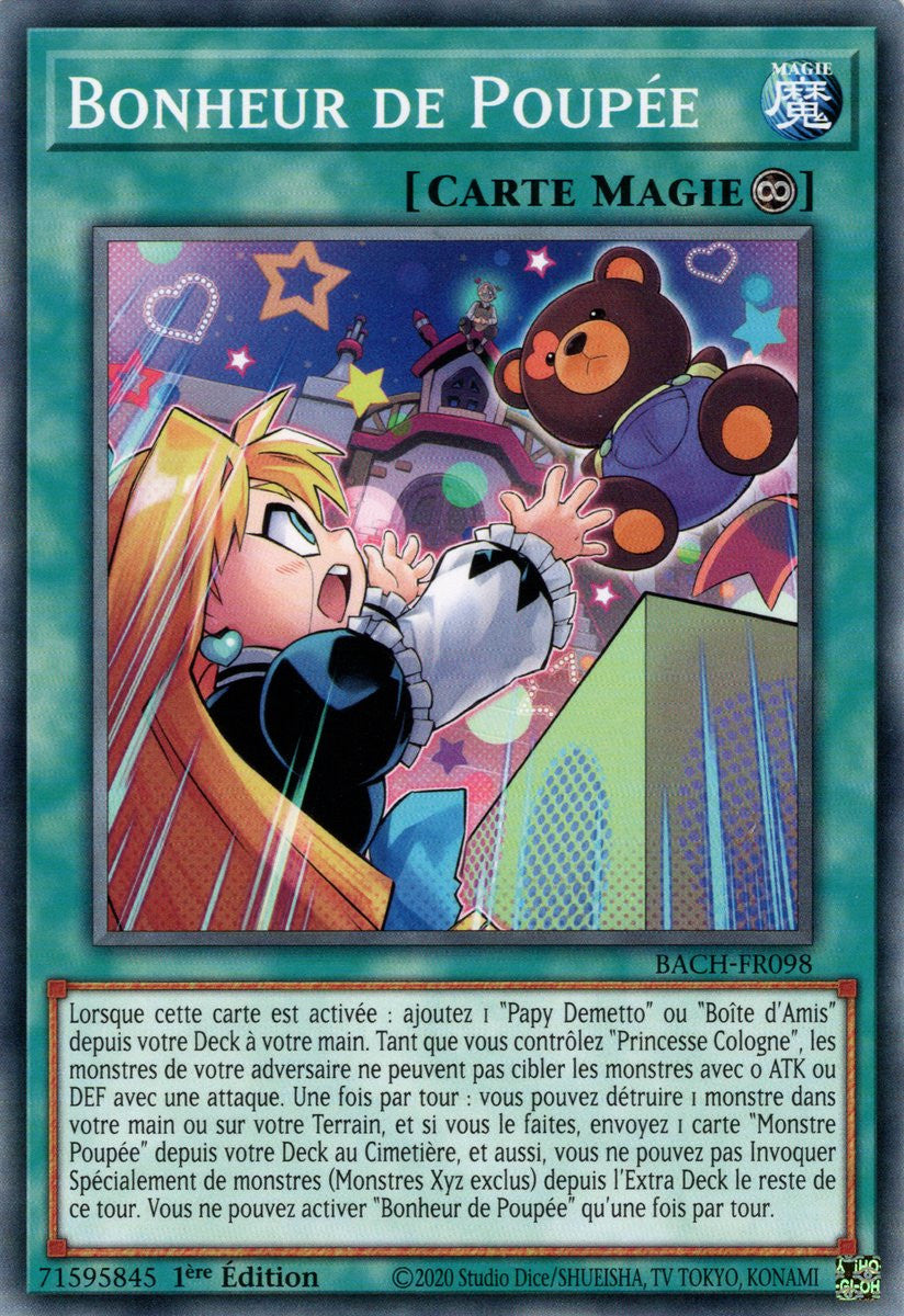 Lorsque cette carte est activée : ajoutez 1 "Papy Demetto" ou "Boîte d'Amis" depuis votre Deck à votre main. Tant que vous contrôlez "Princesse Cologne", les monstres de votre adversaire ne peuvent pas cibler les monstres avec 0 ATK ou DEF avec une attaque. Une fois par tour : vous pouvez détruire 1 monstre dans votre main ou sur votre Terrain, et si vous le faites, envoyez 1 carte "Monstre Poupée" depuis votre Deck au Cimetière, et aussi, vous ne pouvez pas Invoquer Spécialement de monstres (Monstres Xyz exclus) depuis l'Extra Deck le reste de ce tour. Vous ne pouvez activer "Bonheur de Poupée" qu'une fois par tour.