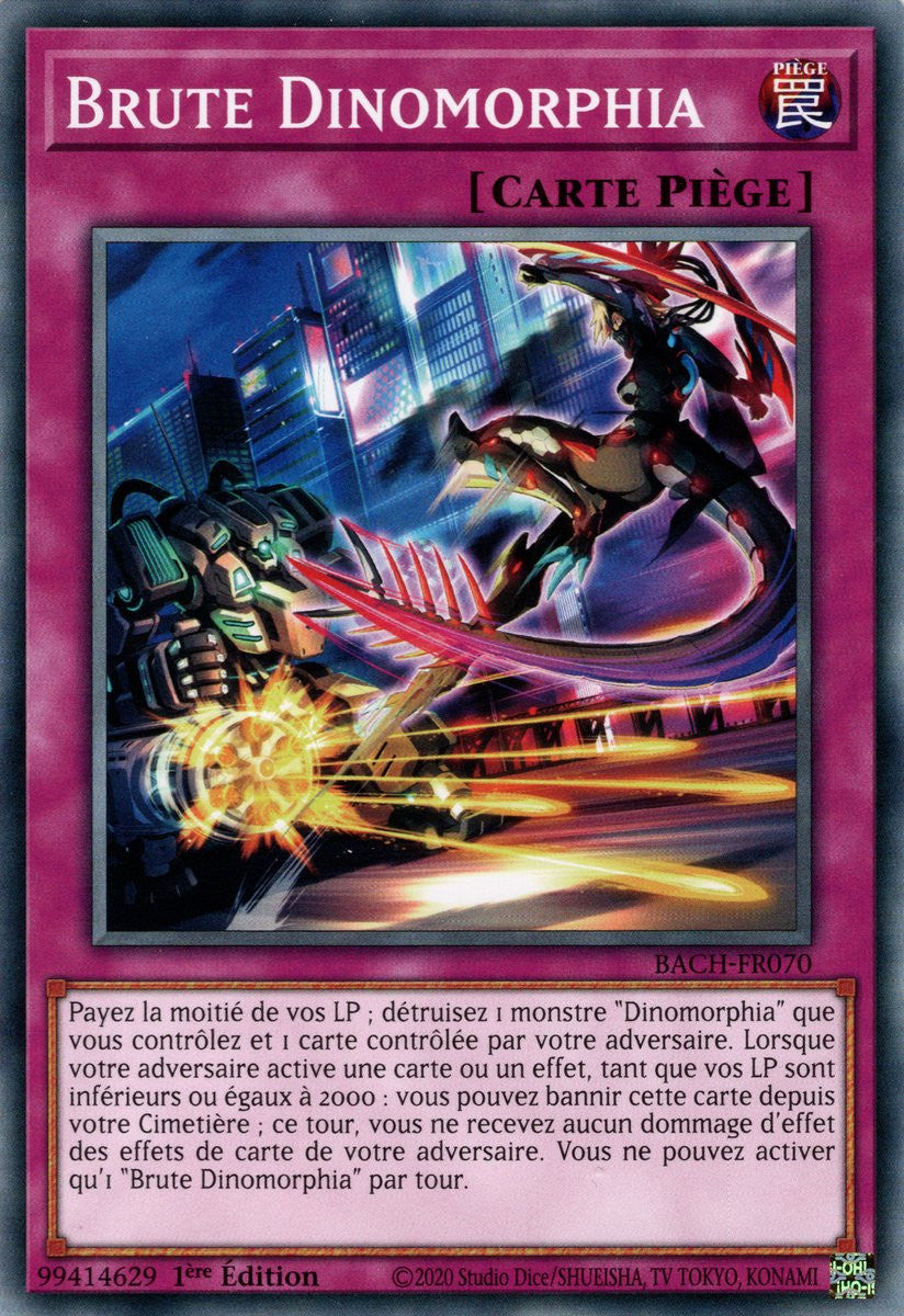 Payez la moitié de vos LP ; détruisez 1 monstre "Dinomorphia" que vous contrôlez et 1 carte contrôlée par votre adversaire. Lorsque votre adversaire active une carte ou un effet, tant que vos LP sont inférieurs ou égaux à 2000 : vous pouvez bannir cette carte depuis votre Cimetière ; ce tour, vous ne recevez aucun dommage d'effet des effets de carte de votre adversaire. Vous ne pouvez activer qu'1 "Brute Dinomorphia" par tour.